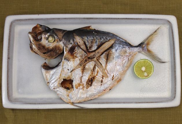 ギンカガミの塩焼き 水洗いして振り塩をする。1時間以上寝かせて、じっくりと焼き上げる。やや硬く締まるのが気になるが、皮、血合いなどに独特の風味と酸味があって、個性豊かな味わい楽しめる。クリックで閉じます![]()