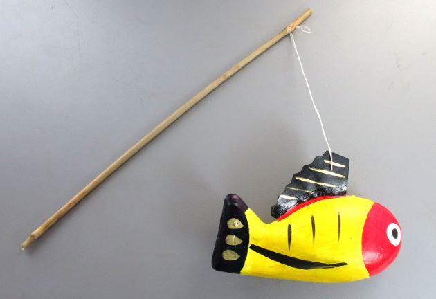 黄鮒 栃木県宇都宮市に伝わる張り子の郷土玩具。「昔宇都宮地内に、ほうそう(天然痘)が流行り多くの病人が出た。そこで村人達は神に祈り、病気平癒を願った。ある日信心深い一村民が、病人に与えるために魚を釣りに出かけ、鯉のように大きな黄色い鮒を釣り揚げた。この変わった色の鮒を病人に与えたところ、病気はあとかたもなく治った。後年村人達は、これを神に感謝し、また病気よけとしてこの黄鮒の型を取り、毎年新年に神にそなえるようになった」。[ふくべ洞 小川昌信 栃木県宇都宮市]クリックで閉じます![]()