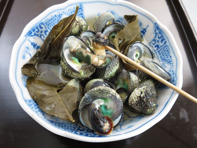 「しったか(バテイラ)」が磯から姿を消すと次に目につくのは本種である。地方によっては「にーな」「たま」などと呼ばれて親しまれている。ヘソアキクボガイは市場で希に見る事があるが、本種はほとんど見かけない。