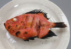クルマダイの丸焼き 比較的腹の中がきれいな魚なので、ざっと洗って水を拭き取り、そのまま焼ける。弱火でじっくり焼き、強火にして表面を軽く焦がす。焼き上がったらこの表面の鱗と皮を外すと、しっとりとしたうま味豊かな白身が出てくる。肝なども非常にうまい。焼くと蒸すの中間的な味が楽しめる。