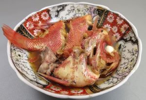 クルマダイの煮つけ 面倒だが硬い鱗をひく。水洗いして肝、胃袋などを取り分けて置く。水分をよくきり、湯通しする。冷水に落として残った鱗やぬめりを流す。これを酒と醤油で煮る。みりん、砂糖などで甘味を加えるとご飯に合う。身は硬く締まりすぎず甘みがある。肝、胃袋などが非常にうまい。
