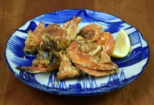 クルマダイの唐揚げ 小振りのものなどは唐揚げにすると鰭や頭部などあまり捨てる部分がなく食べられる。水洗いして適当に切り、水分をよく拭き取る。片栗粉をまぶしじっくりと二度揚げする。骨が硬いので丸ごと全部とはいかないが、鰭が香ばしく、付着した身に甘みがある。