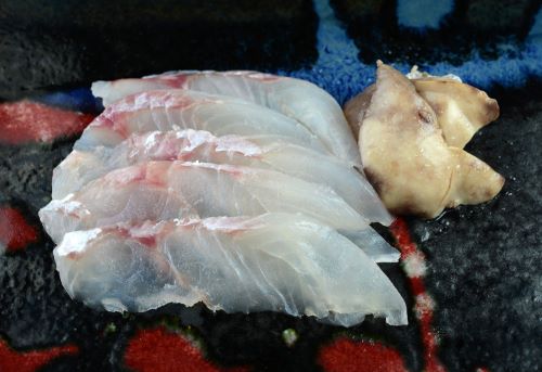 クルマダイの刺身 水洗いして、鱗はとっても、取らなくてもいい。三枚に下ろして、血合い骨・腹骨を取る。肝は湯通ししておく。内臓は基本的に熱を加えた方がいいと思っている。活魚の場合は生でも使えるとは思うが、一般的ではない。鮮度のいいものは身がしっかり締まっているので皮を引き、薄めに切る。肝と一緒に盛る。そのままわさび醤油で食べてもいいが、肝を醤油の中でつぶしてからめて食べるとより味わい深い。