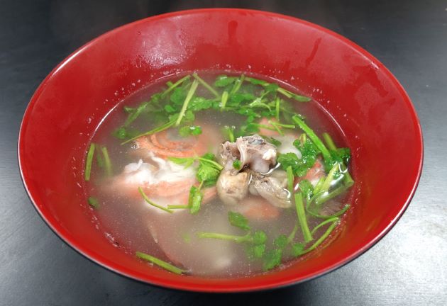 クルマダイの潮汁 非常に濃厚でありながら、後味のいいだしが出る。みそ仕立てでもいいが、塩と酒であっさりというのもいい。あらを集めて置く。湯通しして冷水に落とし残った鱗やぬめりを流す。これを昆布だしで煮だして酒と塩で味つけする。