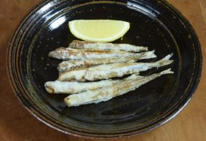 クルメサヨリの唐揚げ もっとも一般的な料理かも。ザルなどに入れてざっと洗う。頭部と内臓を取り、水分をよくきる。片栗粉をまぶしてじっくりと二度揚げする。骨が柔らかいのでさくさくと香ばしく、独特の風味があってとてもおいしい。クリックで閉じます![]()