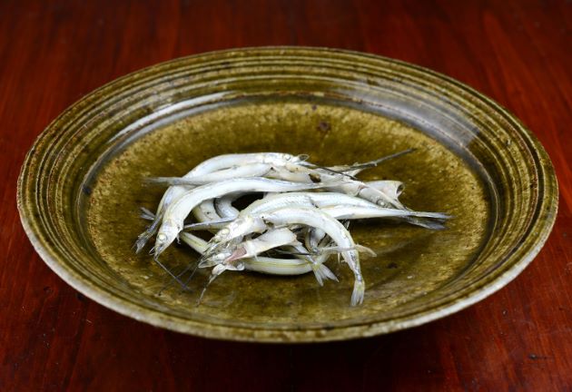 クルメサヨリの塩ゆで(煮干し) 小型魚ではあるが、特に小さいものを選んで、ざっと水洗いして、水分をよくきる。これを強めの塩水でゆであげる。火が通ったらザルにあげ、団扇などであおいで放冷する(冷やす)。このまま食べてもいいが、少し風通しのいい場所で乾かしてもいい。骨が柔らかいので、丸ごと食べられて内臓がほろ苦い。