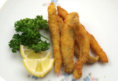 シタビラメのグージョネット(クロウシノシタのフライ) フライにしてもよい。グージョネットはフランス語で小魚を意味している。五枚に下ろして帯状に切り、小魚の形にして塩コショウする。小麦粉をつけて衣(小麦粉・卵・少量のパルメザンチーズ・少量の水)をからめてパン粉をつけて揚げる。大振りにして揚げるよりも手軽にスナック感覚で楽しめる。