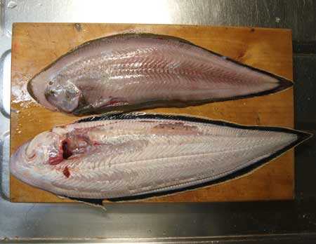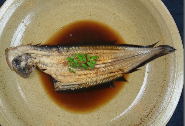 クロウシノシタの煮つけ 漁師さんなどはご飯のおかずに甘辛く煮つける。このとき皮を剥くか、それとも皮付きで煮るかは好みの分かれるところ。ここでは皮を引き内臓を取る。水分をよくきり、湯通しして冷水に落とす。これを酒・醤油・水で煮る。みりん、砂糖で甘味をつけてもいい。身は薄いもののくせがなく煮ても軟らかくておいしい。クリックで閉じます![]()