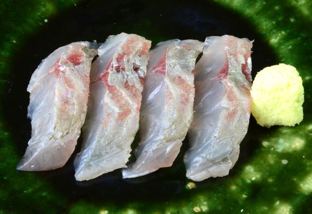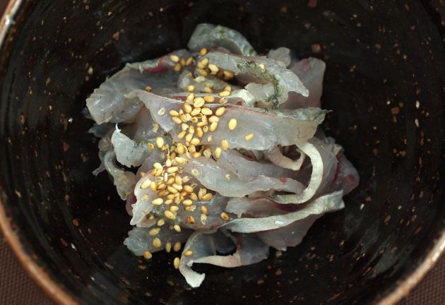 クロサギ皮つき刺身 皮は薄く柔らかいので生で食べても気にならない。水洗いして三枚に下ろして腹骨・血合い骨を取る。これを端から薄く切り放していく。活魚でなくてもおいしい。皮目に食感と、独特の風味とうま味がある。