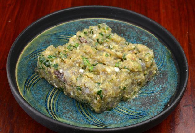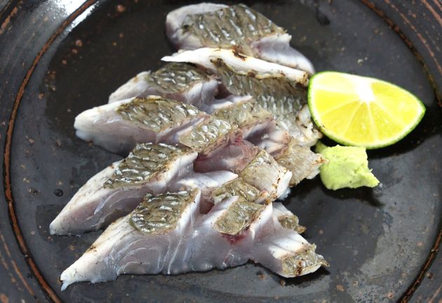 クロサギの焼霜造り 三枚に下ろして腹骨と血合い骨を取る。皮目をバーナーであぶり、氷水に落として水分をよくきる。少し寝かせて、皮目を落ち着かせてから刺身状に切る。鮮度が多少悪くても作ることができる。炙ることで香ばしさが生まれとても味わい深い。クリックで閉じます![]()
