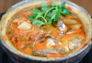 クロサバフグのキムチ鍋 水分が多くあまりうま味がないので、できれば皮を残して料理したいが、剥き身などではそれができない。ここではキムチの素とシャンタンを使った汁の中で煮て食べる。剥き身などは塩を揉み込み、半日以上寝かせて水分を取る。出て来た水分を拭き取り、食べやすい大きさに切る。これをキムチの素(白菜キムチでもいい)、シャンタンで作った地で煮ながら食べる。クリックで閉じます![]()