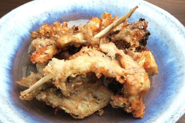 クロサバフグの唐揚げ 水洗いして皮を剥き、眼球なども取る。適宜に切り、ふきんなどに包み、一昼夜寝かせて水分を抜く。片栗粉をまぶしてじっくりと揚げる。揚げ上がりに塩コショウ、カレー塩などを振る。クリックで閉じます![]()