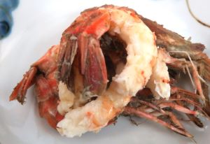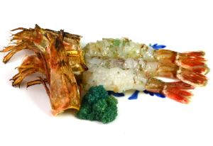 クロザコエビの刺身 殻が薄く軟らかい。これを剥き、わたなどを取り去る。これを塩を加えた湯の中で1秒ほど湯通しする。完全な生でもおいしいがより甘味が強くなり、表面の火の通った部分はほろほろとして食感が楽しめる。クリックで閉じます![]()