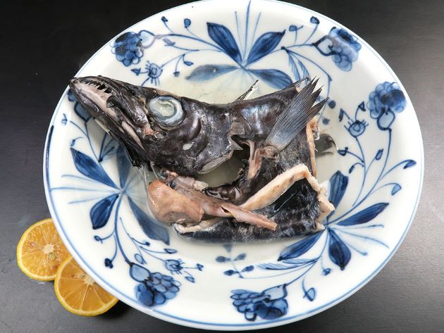 クロシビカマスの塩煮(まーす煮) 鋭い歯に気をつけて、水洗い。鍋に入る大きさに切り、肝、胃袋などと一緒に湯にくぐらせる。冷水に落として滑りや血液を洗い流す。これを少量の塩水で短時間煮上げる。身をせせり取り、煮汁にからめながら食べるととても味わい深い。柑橘類と好相性だ。