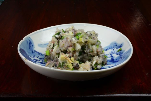 クロシビカマスのなめろう 水洗いして身をかきだして、みそ、ねぎなどの香辛野菜(みょうが、青じそ、玉ねぎ)を合わせてよく切れる包丁でとんとんとたたく。少し粘りけを持つくらい叩いても、あらくたたいてもおいしい。意外にご飯にも合うし、ソテーして食べてもいい。
