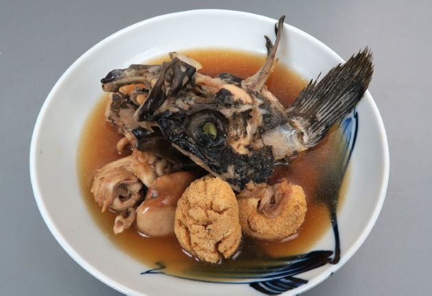 クロソイのあら煮 頭部や中骨、胃袋、肝、卵巣などを集めて置く。湯通しして冷水に落として残ったぬめりや鱗を流す。水分をよくきり、酒・醤油・水で煮つけにしたもの。大振りのあらは実に味わい深い。また肝、卵巣が実にうまい。ご飯に合わせるならみりん、砂糖などで甘味を加えるといい。クリックで閉じます![]()
