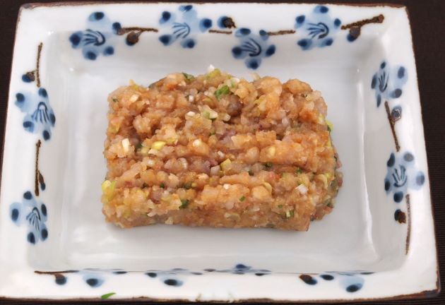 クロタチカマスのみそたたき(なめろう) 水洗いして三枚に下ろして身側からスプーンなどで身をかきだす。これをみそ、香辛野菜などと細かくたたいたもの。マアジやイサキなどよりも脂が甘く美味。これを「さんが焼き」にしてもよい。クリックで閉じます![]()