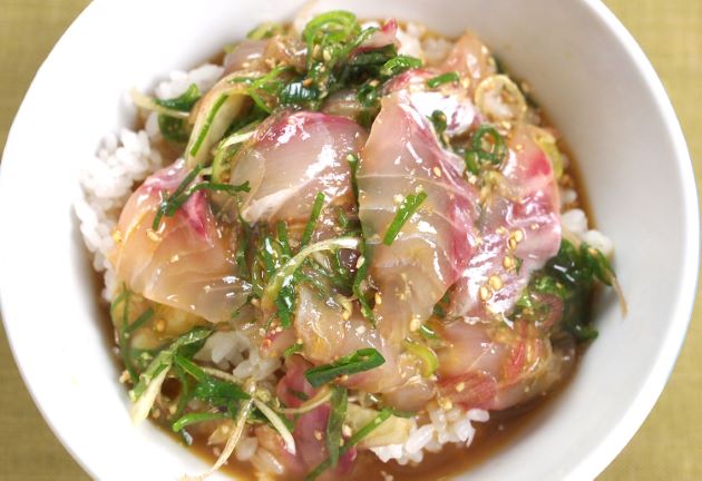 ちぬ飯南予風 たれ(煮きり酒、煮きりみりん、しょうゆ、少量のだしを合わせたもの)と溶き卵(卵黄だけでもいい)を混ぜ、切り身を漬け込んだものをご飯にのせて食べる。さらさらとご飯がよくすすむ。また2杯目は湯もしくは茶を注いで食べてもいい。クリックで閉じます![]()