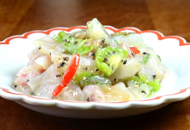 クロダイのマリネ 刺身を作ると必ず中途半端な部分が出る。これを集めて置く。小さめに切り、塩とクラッシュ黒コショウでしめる。半日ほどしめてライムと油(ここではグレープシードオイル)でマリネする。ここに野菜を合わせる。クリックで閉じます![]()
