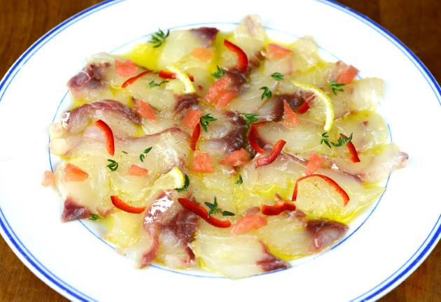 クロダイのカルパッチョ 三枚に下ろして皮を引く、出来るだけ薄く切る。皿ににんにくをなすりつけ(すり下ろしたにんにくをオリーブオイルに溶かし込んでもいい)、オリーブオイルを塗り塩コショウ、切り身を並べていく。並べ終わったらスプーンなどでとんとんとなじませ、上からも塩コショウ。オリーブオイルをかけて好きな青みを散らす、野菜類を載せるなどする。クリックで閉じます![]()