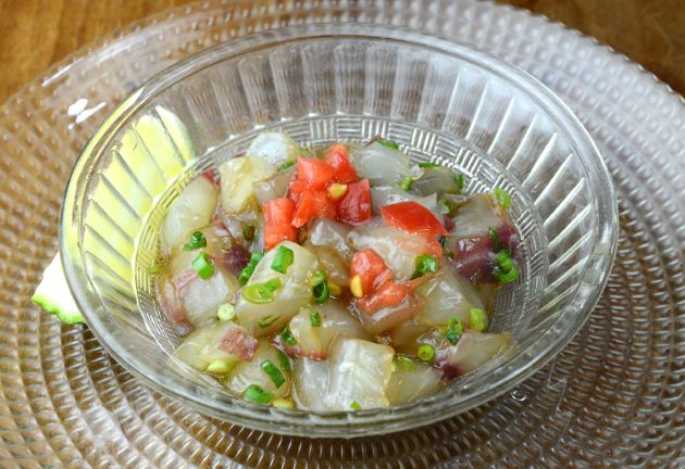 不安定な6月、7月の個体などを使ってもいい。また刺身の切り落としを集めて細かく切ったものでもいい。胡麻油と醤油で和えてねぎを散らす。ホットチリや好みの野菜を加えてもいい。
