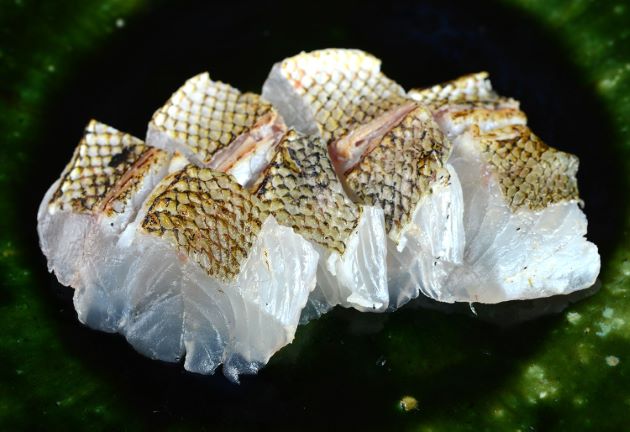 クロホシフエダイの刺身 小型のものを三枚に下ろして血合い骨を抜き取り、切りつけたもの。透明感のある白身で活け締めにしたものは鮮度がよいとやや硬いくらいなので薄く切りつけたもの。上品でいながらうま味があり、またほんのりと甘味も感じられる。食感もよいために食べ飽きない味である。クリックで閉じますクロホシフエダイの刺身
