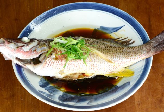 クロホシフエダイの蒸魚(清蒸) 水洗いする。頭部の鱗は金ブラシなどでてっていてきに取る。水分をよくきり、ねぎなどを敷いた皿に乗せて酒を振る。これを15分前後蒸す。蒸し上がったらタレをかけ、香りのある野菜を乗せて煙が出るくらいに熱した油をかける。タレは中国の甘い醤油でもいいし、作ってもいい。タレは醤油・魚醬少々・紹興酒・砂糖少々を合わせて一煮立ちさせたもの。酒と一緒に楽しんでもいいが、なんといってもご飯に合う。少々辛いが、剁辣椒を乗せて蒸すとタレなどを作る手間がいらない。