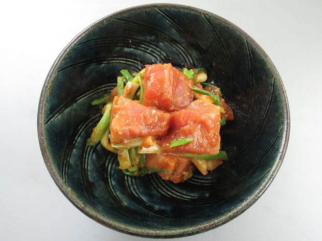 成魚・メジマグロぬた 「まぐろのぬた」は本種の基本的な料理のひとつ。ここでは江戸甘みそを使ったが、みそは選ばない。みそ、酢、砂糖、砂糖を避けたいならみりん、辛子を合わせて、辛子酢みそを作る。これを適宜に切った身と合わせる。関東ではわけぎ、あさつきなどを合わせるが、意外にチシャ(レタス)もいける。