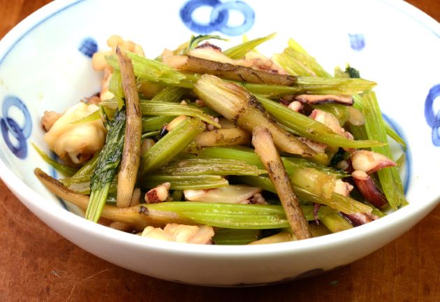 ケンサキイカと若ごぼうの炒め煮 ケンサキイカだけではなく、イカのげそはすぐに食べるのではなく、冷凍保存して置くととても便利である。大阪市八尾の「若ごぼう」を見つけたので、一緒に煮てみた。ごぼうに似た風味がして青菜のよさもある。いかげそは解凍して適当に切る。これを下煮した「若ごぼう」と一緒に炒めて酒、みりん、薄口醤油で煮る。クリックで閉じます![]()