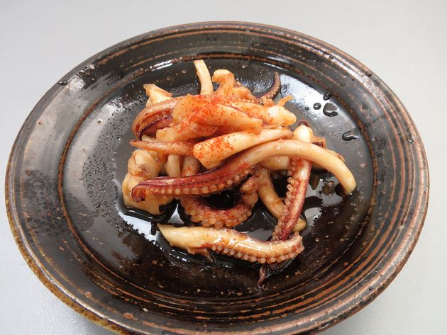 ケンサキイカのげそ煮 げそ(足の部分)をしょうゆ、みりん、酒であっさりと煮たもの。煮すぎると硬くなるので要注意。軟らかく、イカ本来の甘さが楽しめて美味。しょうがで煮てもうまいが、一味唐辛子はとても合う。クリックで閉じます![]()