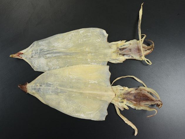 剣先するめ 長崎県、山口県北浦(日本海側)、島根県などで作られている「一番するめ」で非常に高価なもの。胴のいちばん先の部分の皮を剥いて干すが、胴のいちばん先の部分のみ皮を残すのが伝統的なやり方。この部分も取り去っているものも少なくない。クリックで閉じます![]()
