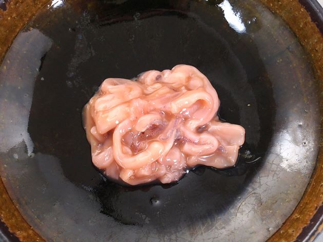 消費地では赤いもの。とれたばかりは白く透明、徐々に赤くなり、また時間がたつと白くなる。消費地で白いものは古い。触って張りのあるもの。味わい