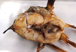 コイチの真子煮 初夏などには抱卵個体がやってくる。成熟の度合いにもよるが、卵粒の小さい時季は非常においしい。卵巣は適当に切り、酒・砂糖・醤油・水を沸騰させた中に落としていく。短時間煮て鍋止めをする。ほくほくとし、甘味がある。クリックで閉じます![]()