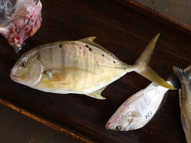 『原色 沖縄の魚』(具志堅宗弘 タイガー印刷 1972)にはGnathanodon speciosus Forsskål で 〈カイワリの仲間〉。