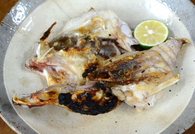 コクテンアオハタの煮つけ 兜を甘辛く煮つけた。こってりした味つけだが、煮染まっているわけではなく、白身のおいしさはそのまま楽しめる。白身のおいしさを楽しんだら、こってり味の煮汁にからめて食べる。クリックで閉じます![]()