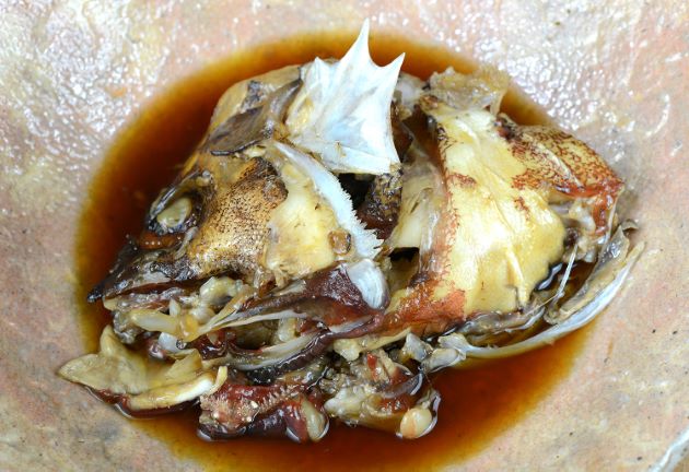頭部(兜)は梨子割りにする。湯通しして残った鱗やぬめりを流す。水分をよくきり、酒・砂糖・醤油・水のこってりした味つけで煮る。