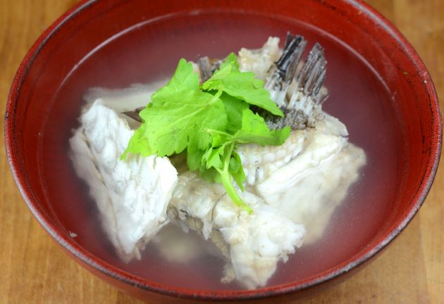 コクテンアオハタの鍋 腹骨の周辺、かまを昆布だしに酒・塩で煮ながら食べる。じっくり煮ると身は柔らかく味が豊かである。おいしいだしが出るので一緒に煮た豆腐や野菜もうまい。クリックで閉じます![]()