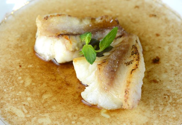 コクテンアオハタのグリエ 上火の強火で焼いたもの。淡泊な中に甘みがあり、たっぷりのオリーブオイルとともに食べるととても味わい深い。クリックで閉じます![]()