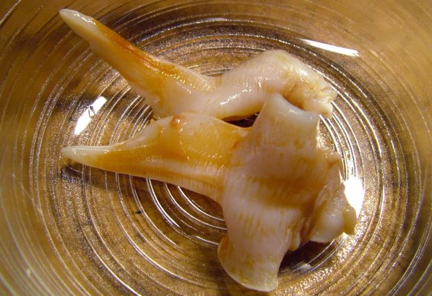 足の部分を主に食べる。足は黄色みがかるが薄く、白っぽく見える。