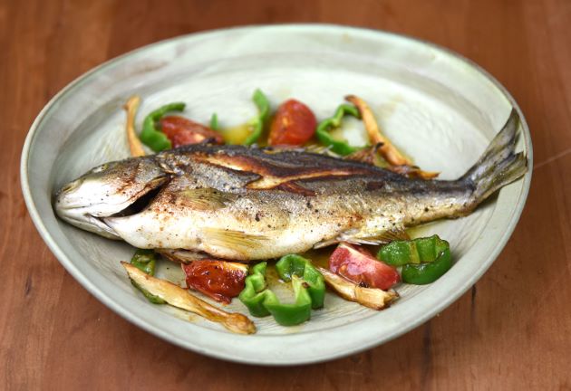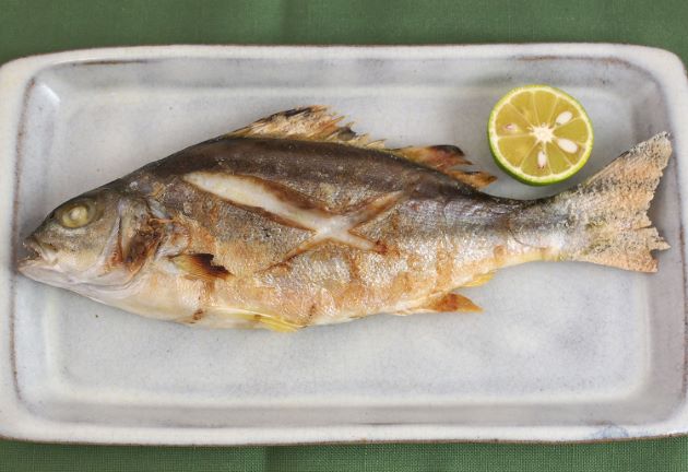 コトヒキの塩焼き 水洗いして水分をよく切り、塩をする。一般家庭なら鰭などは切り取って焼いてもいい。じっくり香ばしく焼き上げる。熱を通すと皮目が硬く香ばしく独特の風味がでる。身もほどよく締まり、おいしい。