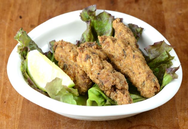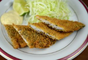 コノシロのフライ 27cm・重さ180g前後のコノシロサイズはうま味豊かで脂がのっているものの、小骨が長く硬い。これを骨切りしてフライにする。三枚に下ろし皮目から細かく横方向に骨切りする。塩コショウして小麦粉をまぶし、衣にからめパン粉をつけて上げる。カレー粉や乾燥パセリなどを使うと万人向きになる。クリックで閉じます![]()