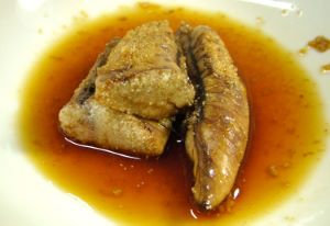 コノシロの煮つけ 20cm以上のコノシロを水洗いして頭を落とす。皮目から1mm刻みに小骨を切り込み、湯通しして、冷水に落として鱗などを取り去る。よく水切りしてしょうゆ、砂糖、酒の味つけで煮ていく。しょうがをきかせて美味。クリックで閉じます![]()