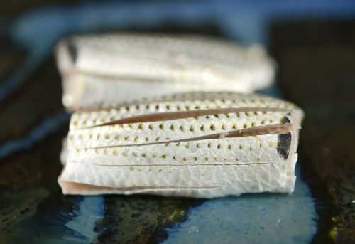 新子の酢じめ 7月の体長6㎝前後を開いて酢で洗ったもの。当日から翌々日くらいまではおいしく食べられる。口に入れるとこのサイズくらいからしっかりコノシロのおいしさがあり、微かに口の中で溶けるような感じも楽しめる。クリックで閉じます![]()