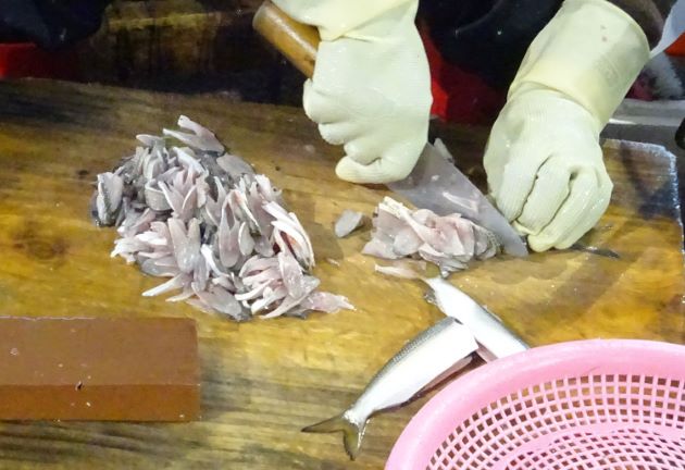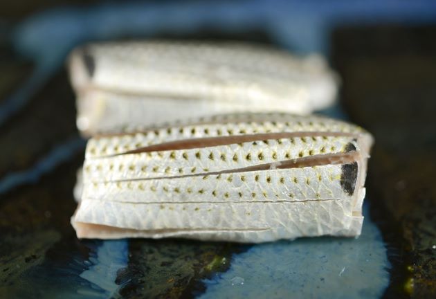 鱗を落とし、頭部と腹部の縁を切り落とす。腹開きにして腹骨を切り取る。塩を振っておいたバットに並べて上からも塩を振り、10分弱。これを酢で洗う。
