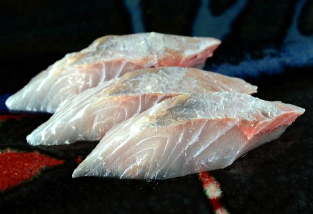 透明感のある白身で血合いが広く赤い。腹側の血合いは薄い。