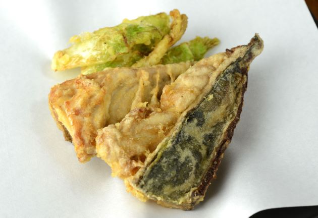 ゴマサバの天ぷら 高温でからっと揚げてみた。皮目の風味が強く、身に強いうま味がある。下味をつけているので冷えてもおいしい。ご飯にも酒にもとても合う。三枚に下ろした尾に近い方を使う。開いて薄くする。振り塩をして少し置く。水分をとり、小麦粉をまぶして衣をつけて高温で揚げる。クリックで閉じます![]()