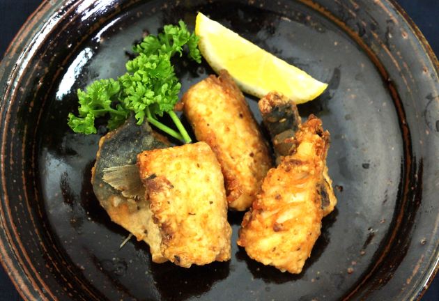 ゴマサバの唐揚げ 水洗いして適宜に切り、カレー粉、コショウ、塩をして片栗粉をまぶして揚げたもの。カレーやスパイス類を使ってもうま味豊かで、香ばしい。単に唐揚げにしてもいいし、竜田揚げにしてもおいしい。クリックで閉じます![]()