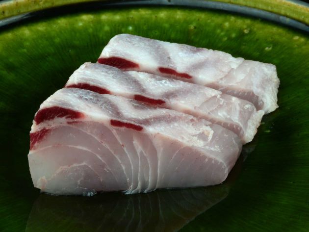 血合いが強い白みで、脂が層を作る。熱を通しても硬く締まらない。栄養