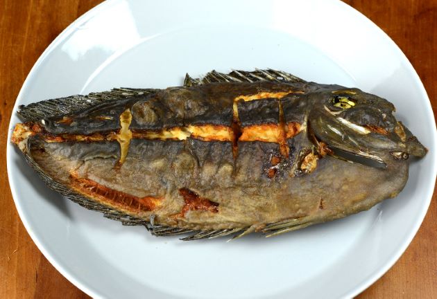 ゴマテングハギモドキの素揚げ ニザダイ科の魚を常食する熱帯域、国内では沖縄などでは素揚げにして食べることが多い。皮が硬く鱗と一体化している。肉厚でうま味豊かな身であるために、揚げてもふっくらとして柔らかい。作り方は単純。内臓と鰓を取り去り、ていねいに水分を拭き取る。適当に切れ目を入れて、じっくり香ばしく素揚げにする。柑橘類と醤油で食べるのだけど、意外にご飯に合う。
