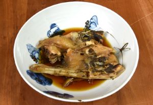 サカタザメの煮つけ 胎盤部分を使って煮つけてみた。水洗いして適当に切り、湯通し、冷水に落として表面のザラザラした鱗を流す。水分をよく切り、酒・しょうゆ・水であっさり煮つける。砂糖・みりん甘味をつけてもいい。吻の両側にある透明な部分がババロアのように柔らかくなり、実にうまい。筋肉にもイヤミがなく、エイ特有のクセもない。非常にうまい。